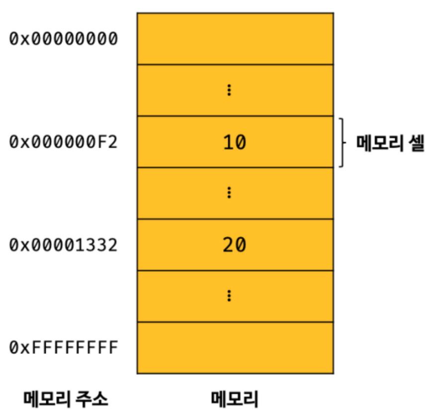 메모리는 메모리 셀의 집합체며, 메모리 셀 하나의 크기는 1바이트 이다.